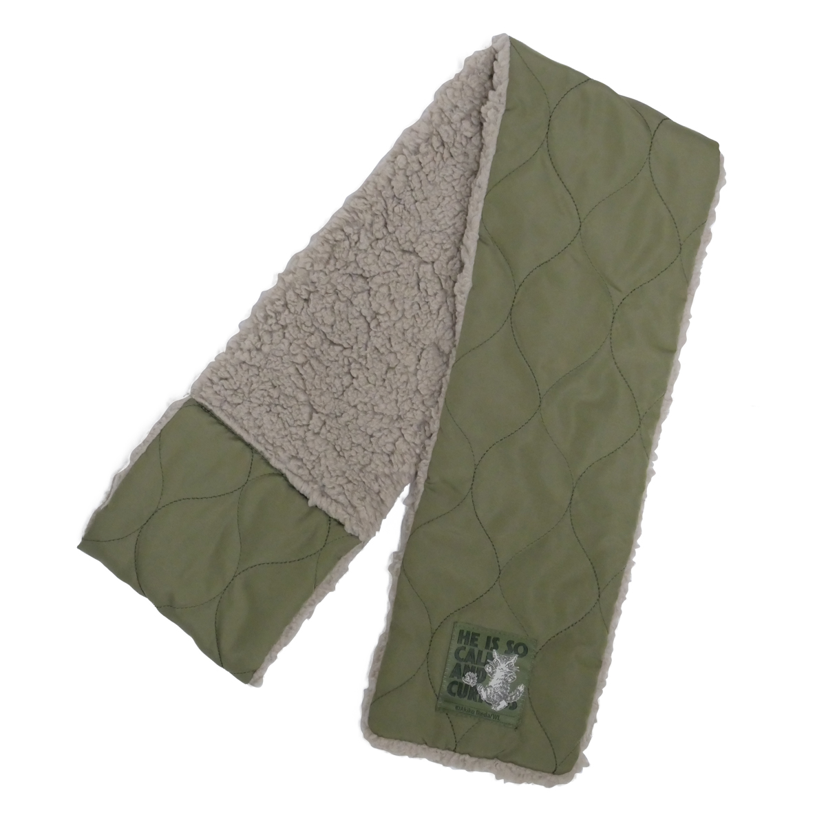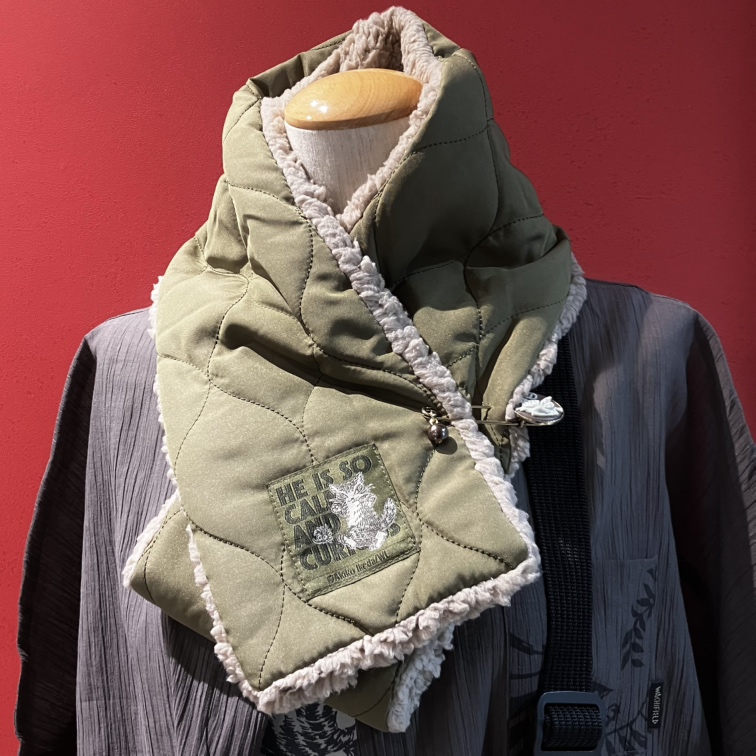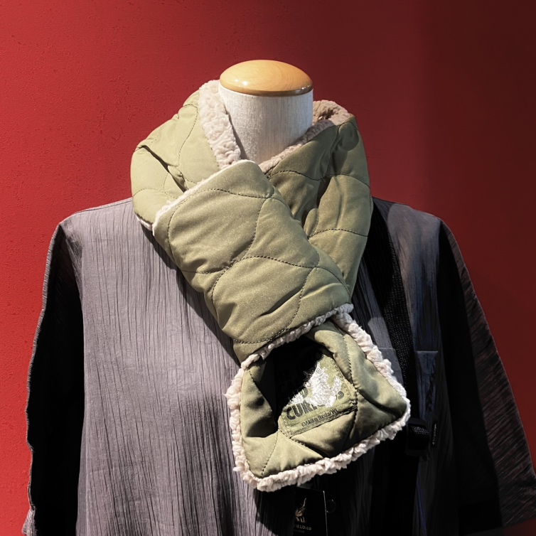ループを通すタイプのマフラーで着脱も簡単です。寒い日やアウトドアにも最適です。