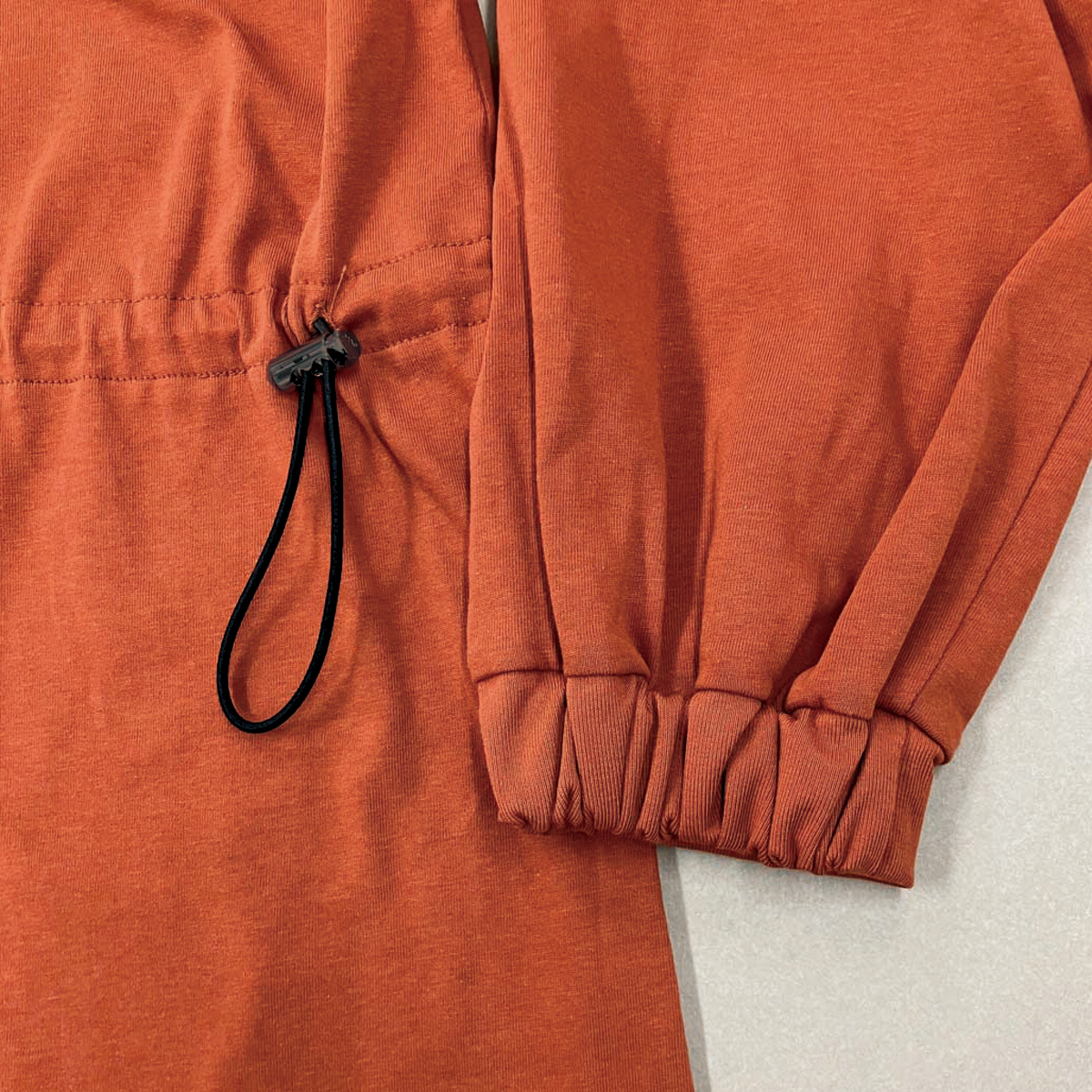 ウエスト辺りのコードはゴム状で、ニュアンスを出してもそのまま絞らずストンっと着てもOK。