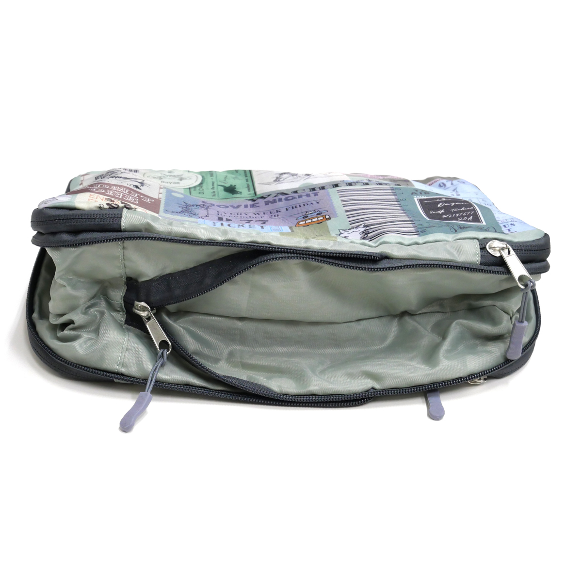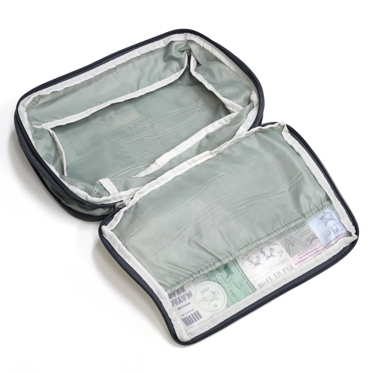 真ん中が仕切りになっていて表裏の2室に収納ができるポーチ。