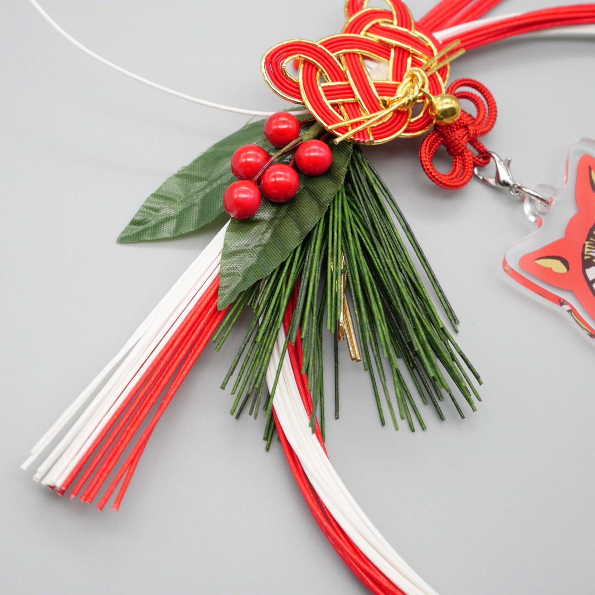鈴が付いた猫結びの水引とだるまダヤンのアクリルチャーム付き。
