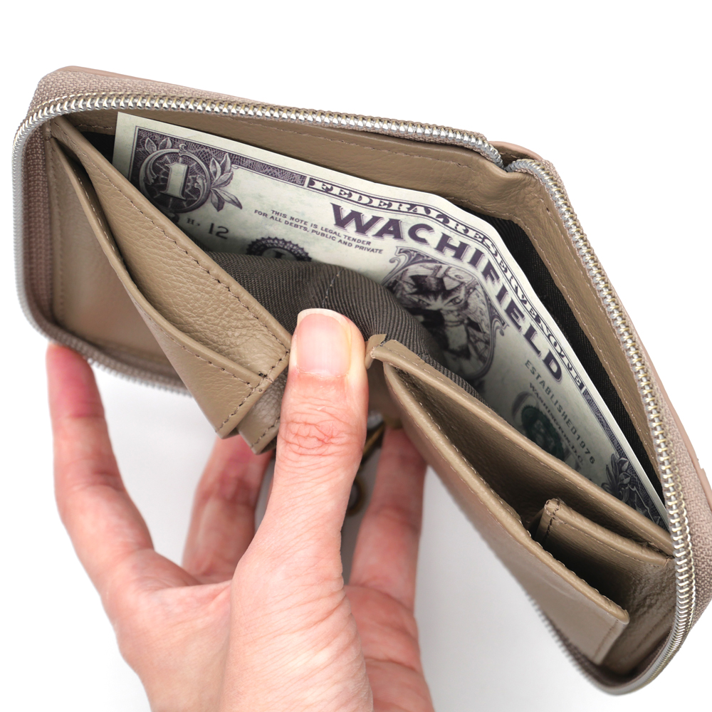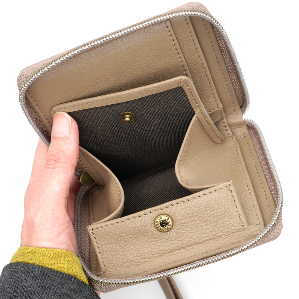 仕様:本体ファスナー開閉・カード×5・札入れ×1・ホック式小銭入れ×1・ハンドル取り外し可能