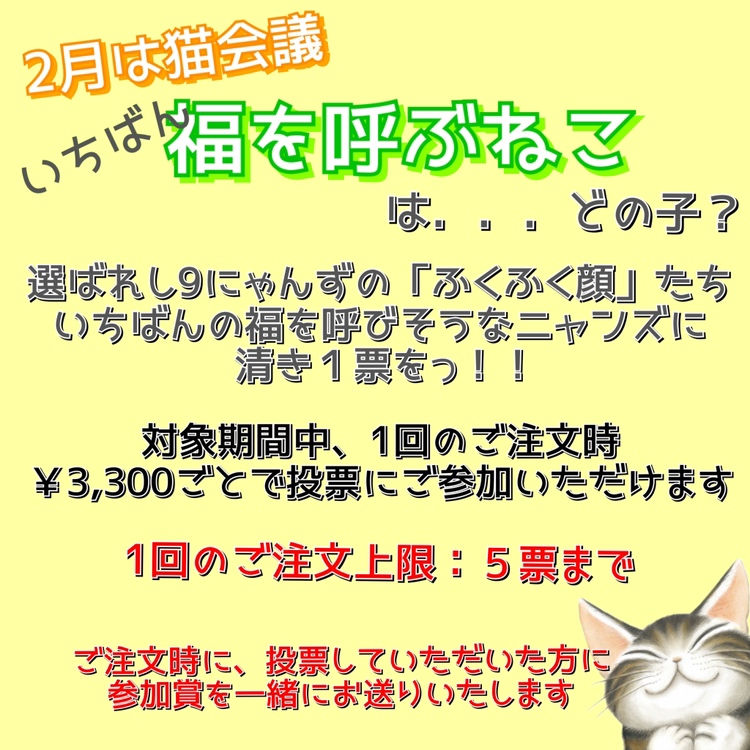 ※ サイト内で、ご注文時に投票したい猫ちゃんにご投票いただかないと、参加賞はお送りしません