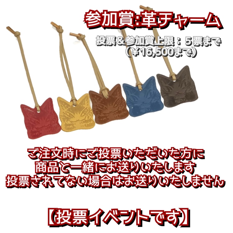 3.投票いただいた票分、参加賞の「革チャーム」を商品と一緒にお送りいたします