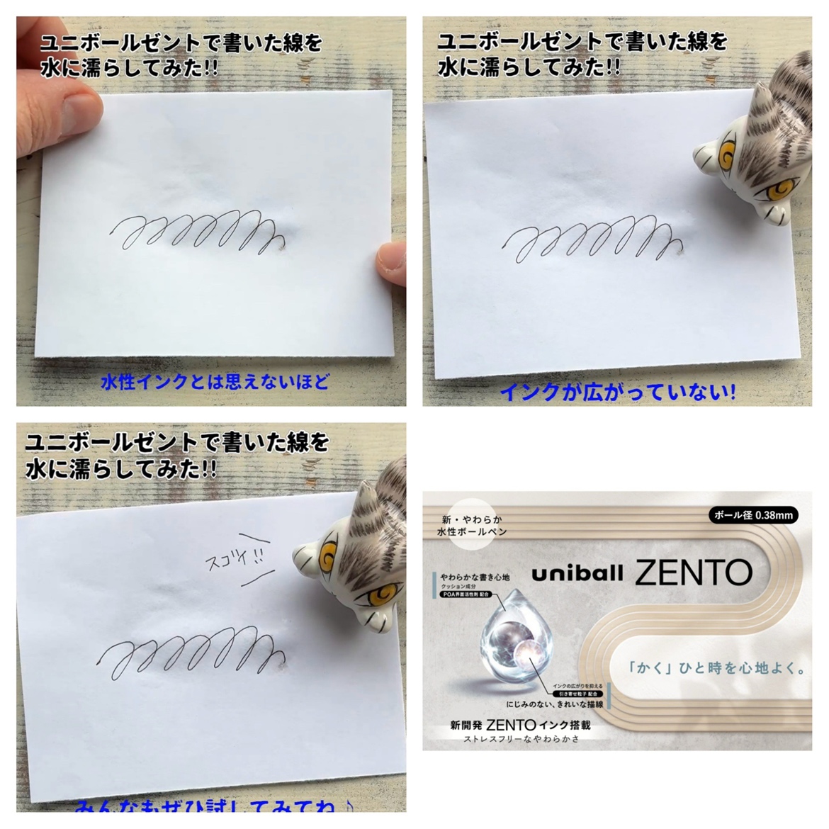 ストレスフリーなやわらかい書き心地と、にじみを抑えたきれいな描線が特長の新開発「ZENTOインク」を搭載した、三菱鉛筆の水性ボールペン。