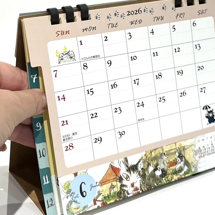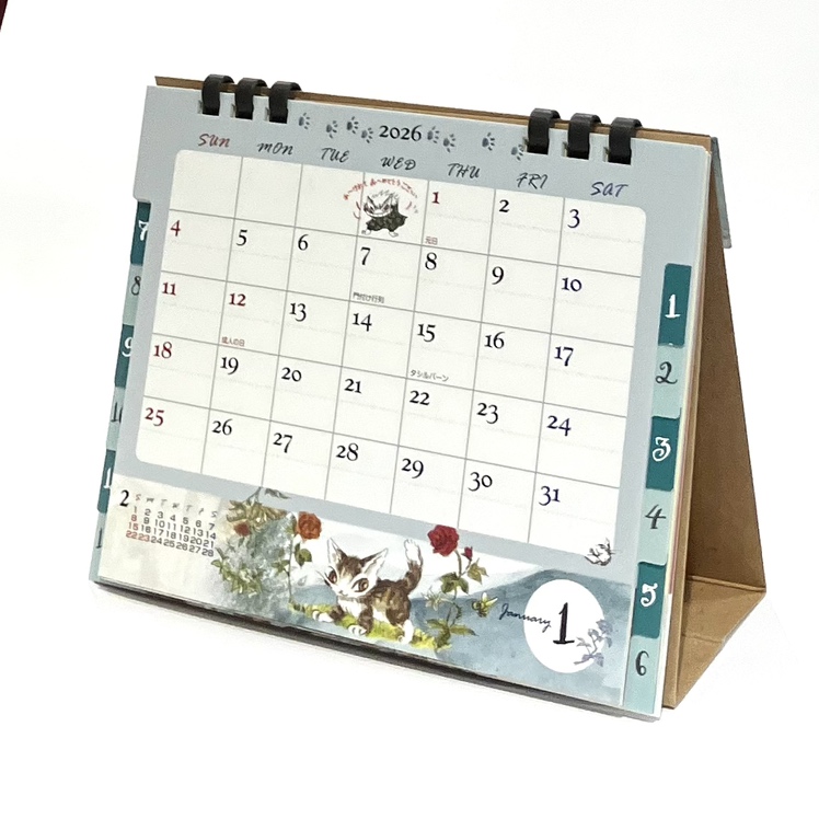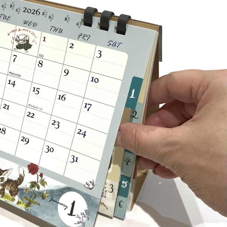 月がめくりやすいサイドの抜型と、書きやすい紙質がポイントです。2026年1月から2026年12月まで使えます。
