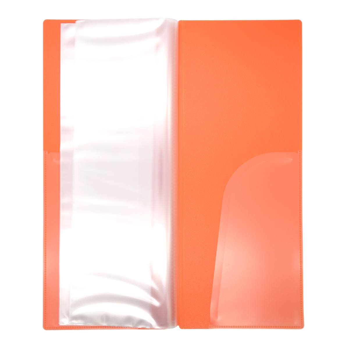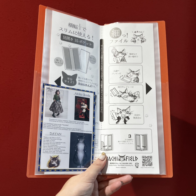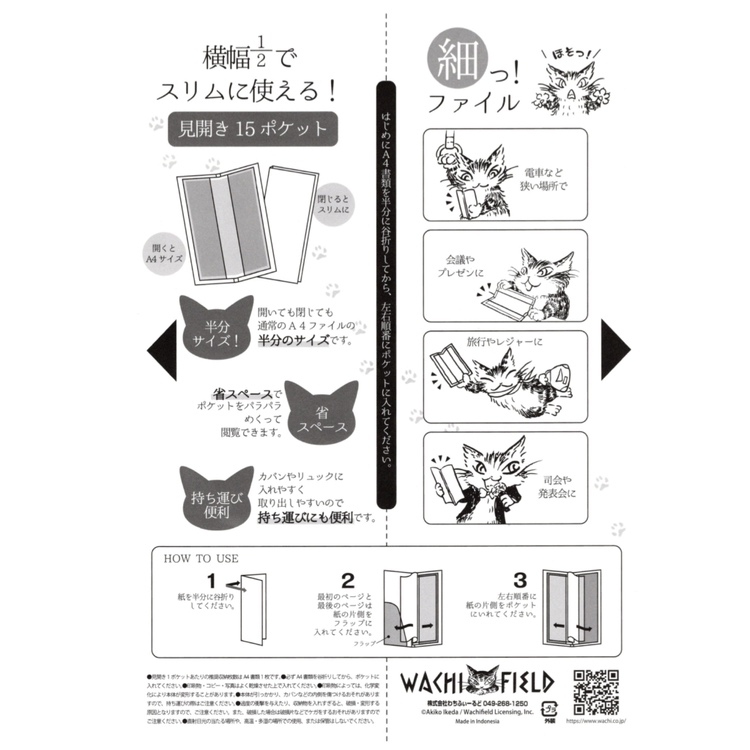 開いても閉じても一般的なA4 ファイルの横幅半分。省スペースでポケットをパラパラめくって閲覧できます。