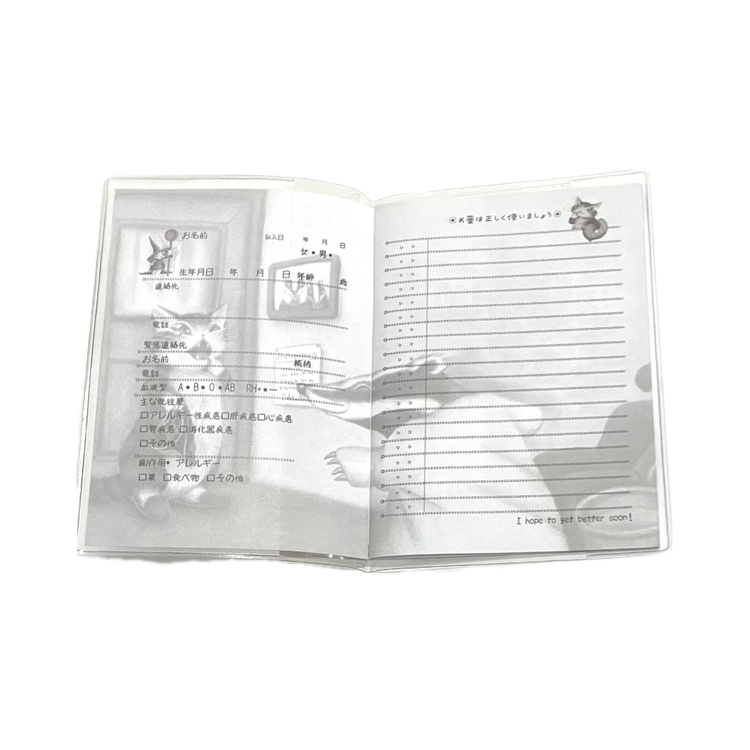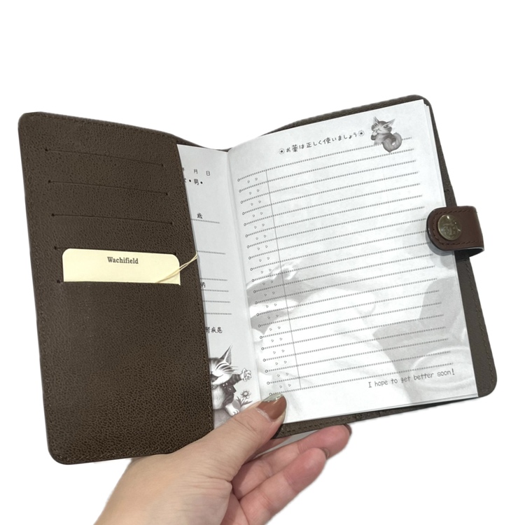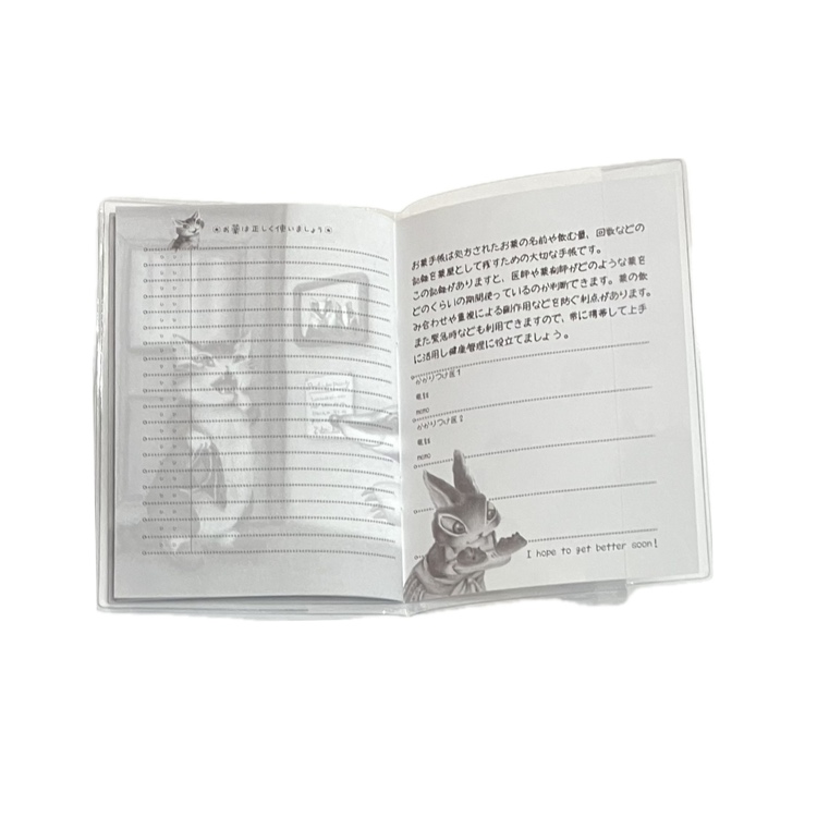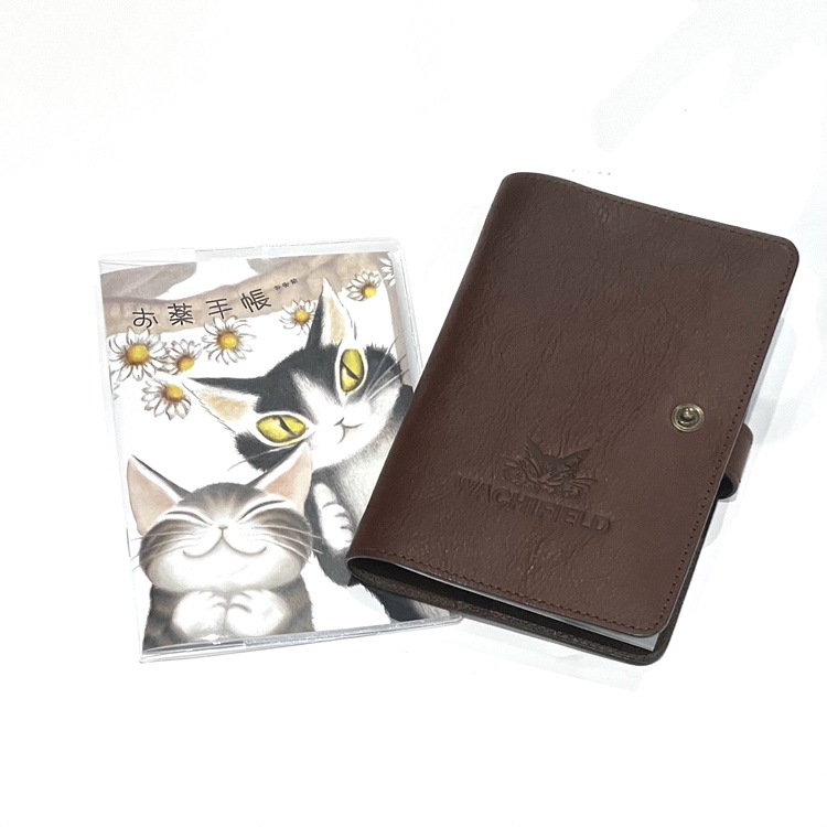 処方されたお薬の記録をつけてもらうおくすり手帳です。カバーにはカードポケット付き。