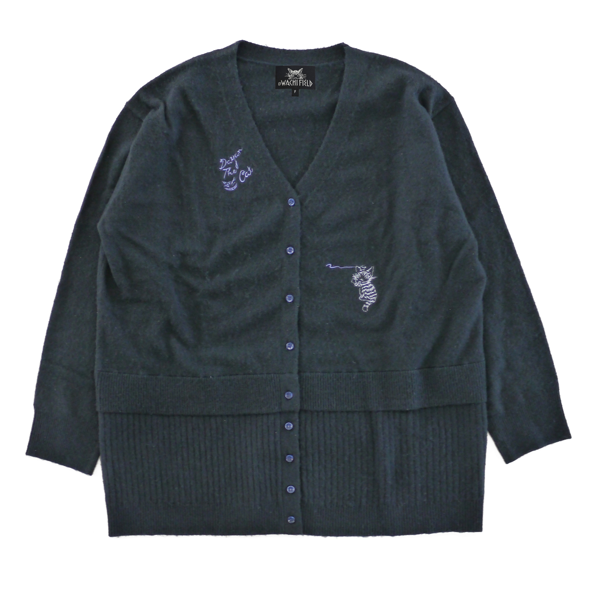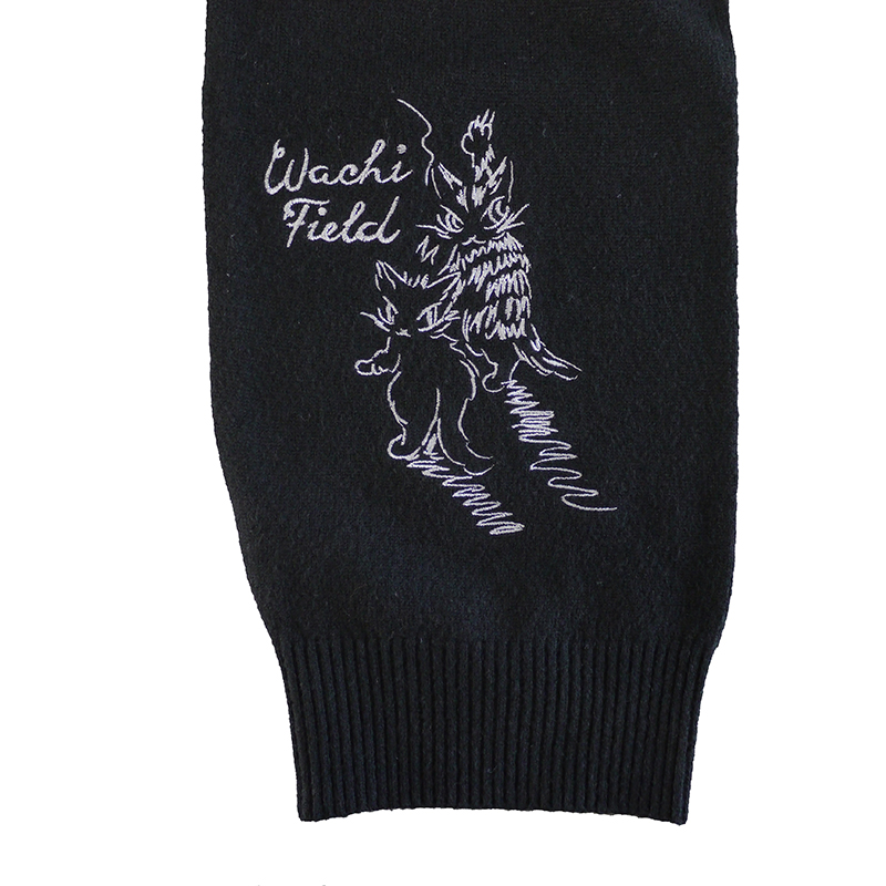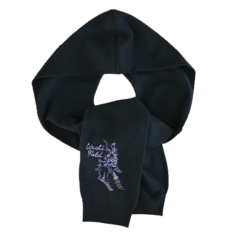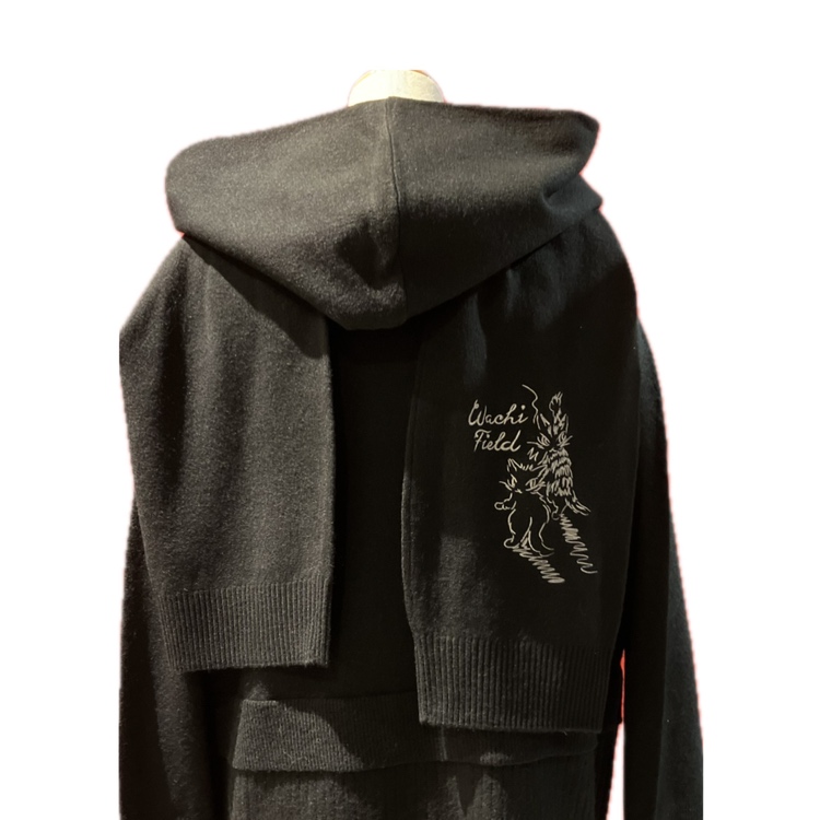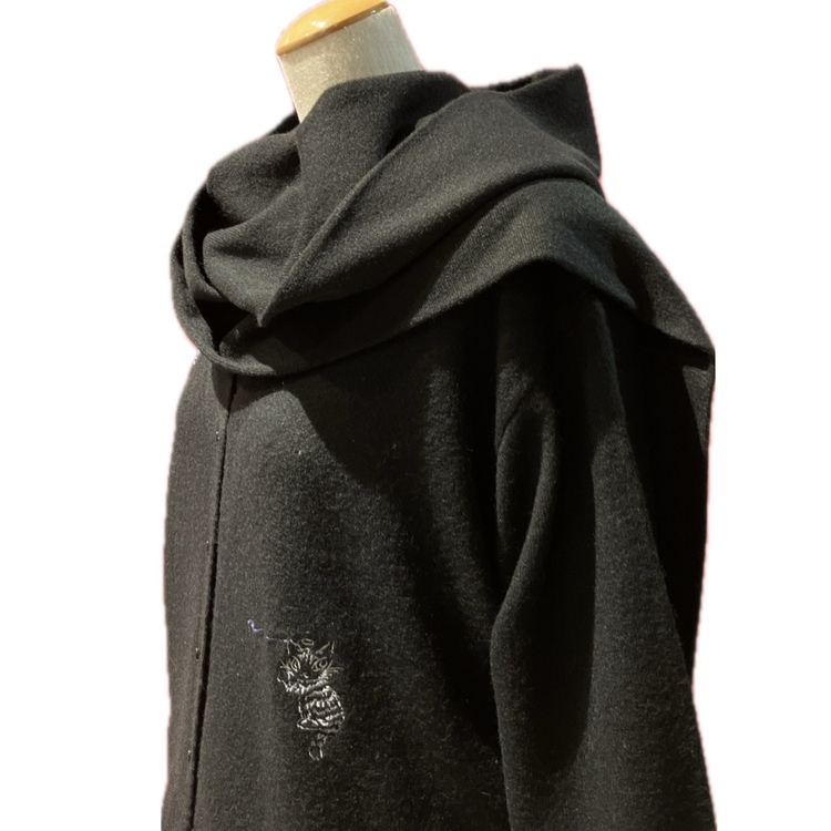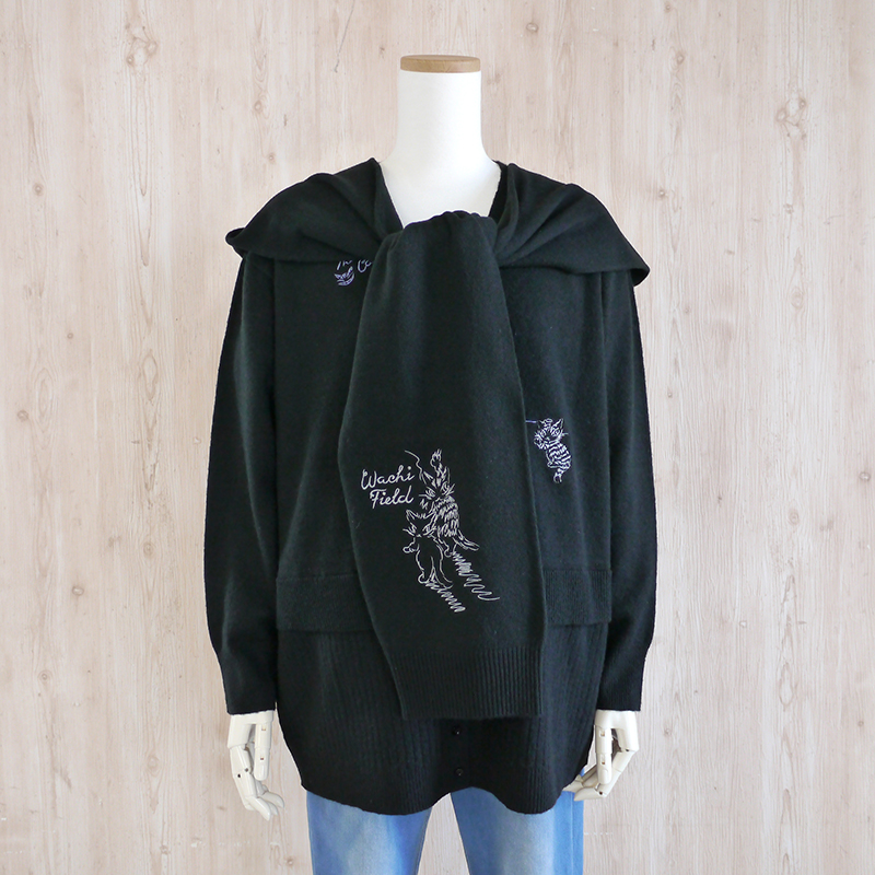 落書きをしているダヤンの刺繍があちこちに散りばめられています。カーデとお揃いで着用できるフードマフラー付きです。