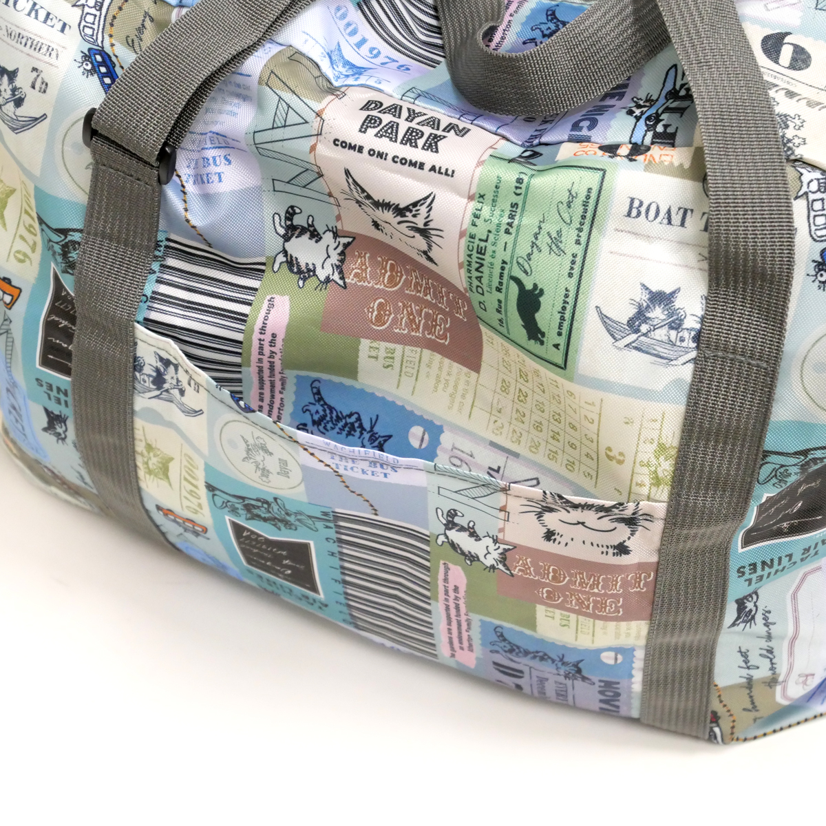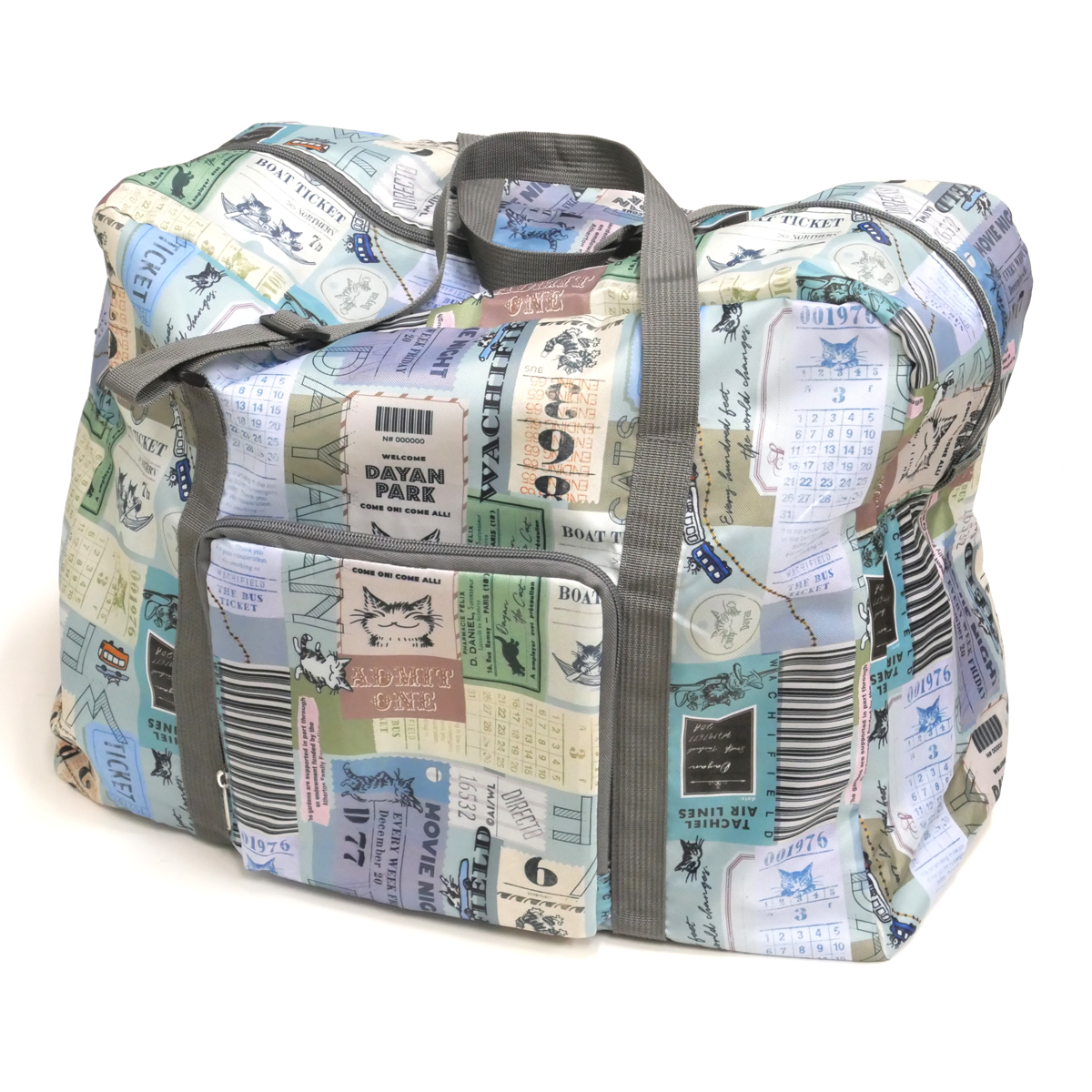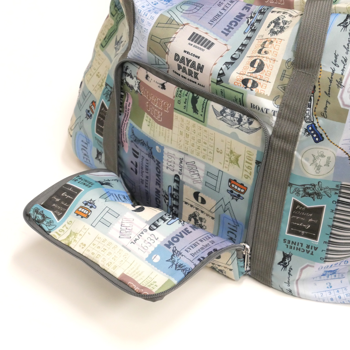 たたんで持ち運べるポケッタブルボストンバッグ。正面のファスナーポケット裏が空洞になっていてキャリーバーを通せます。