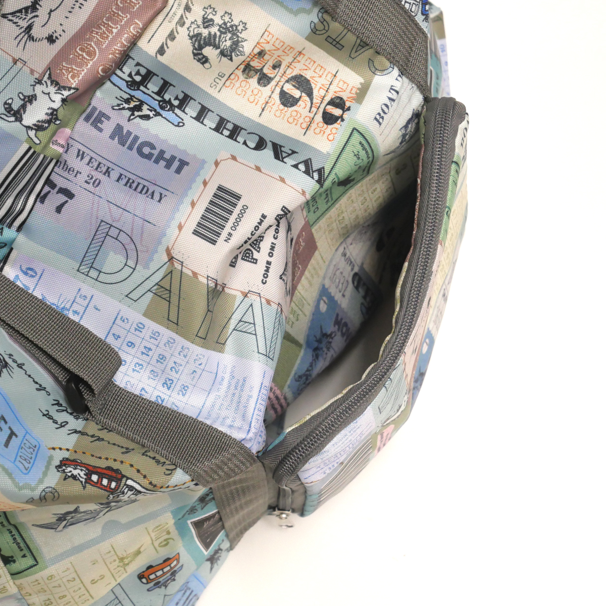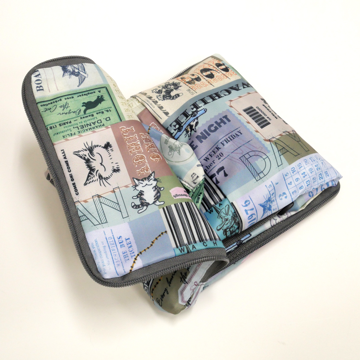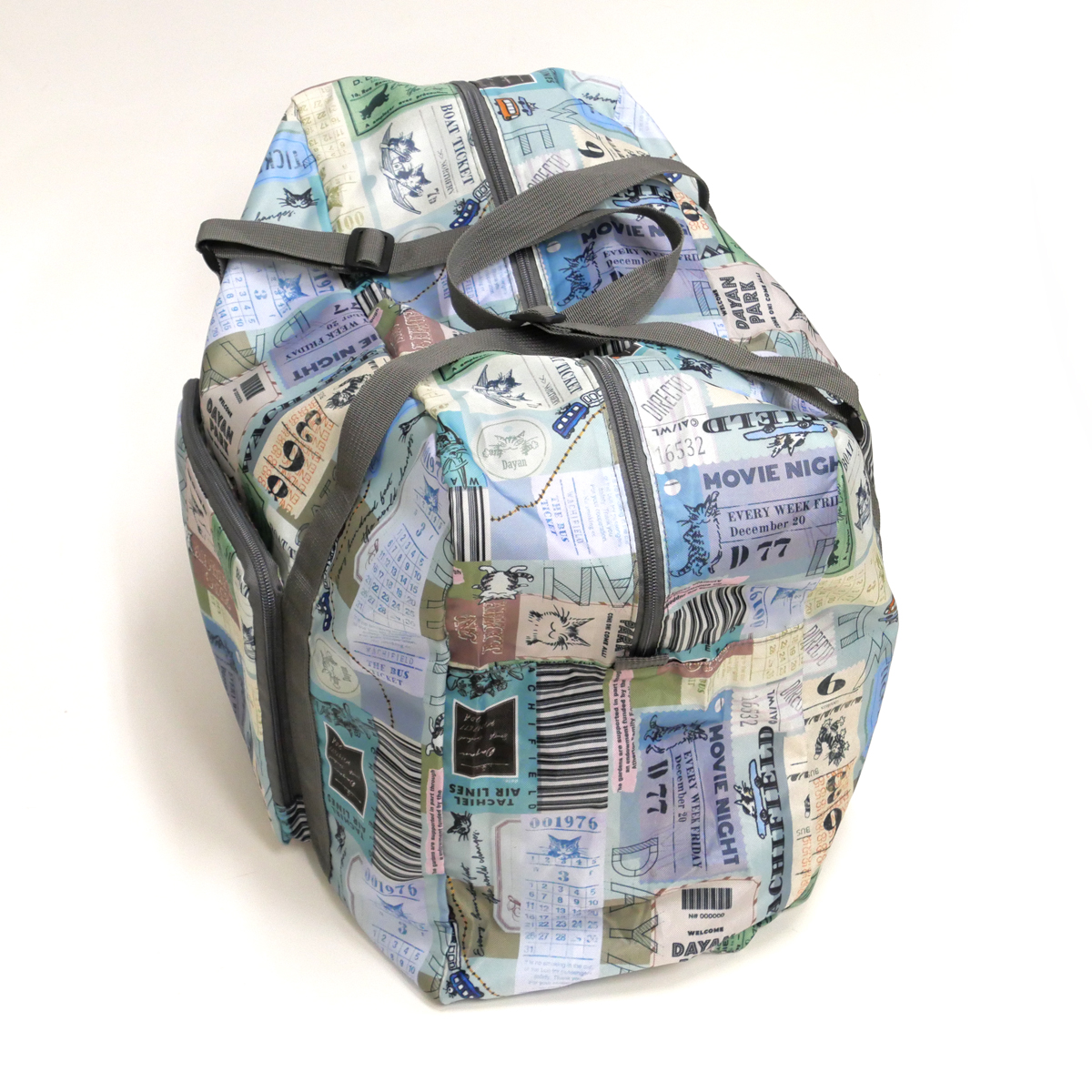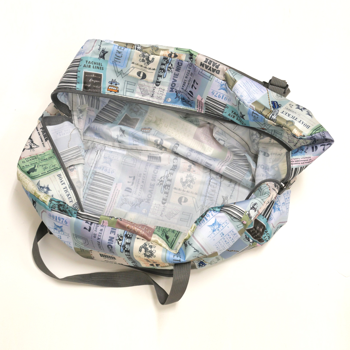 たたんで持ち運べるポケッタブルボストンバッグ。正面のファスナーポケット裏が空洞になっていてキャリーバーを通せます。