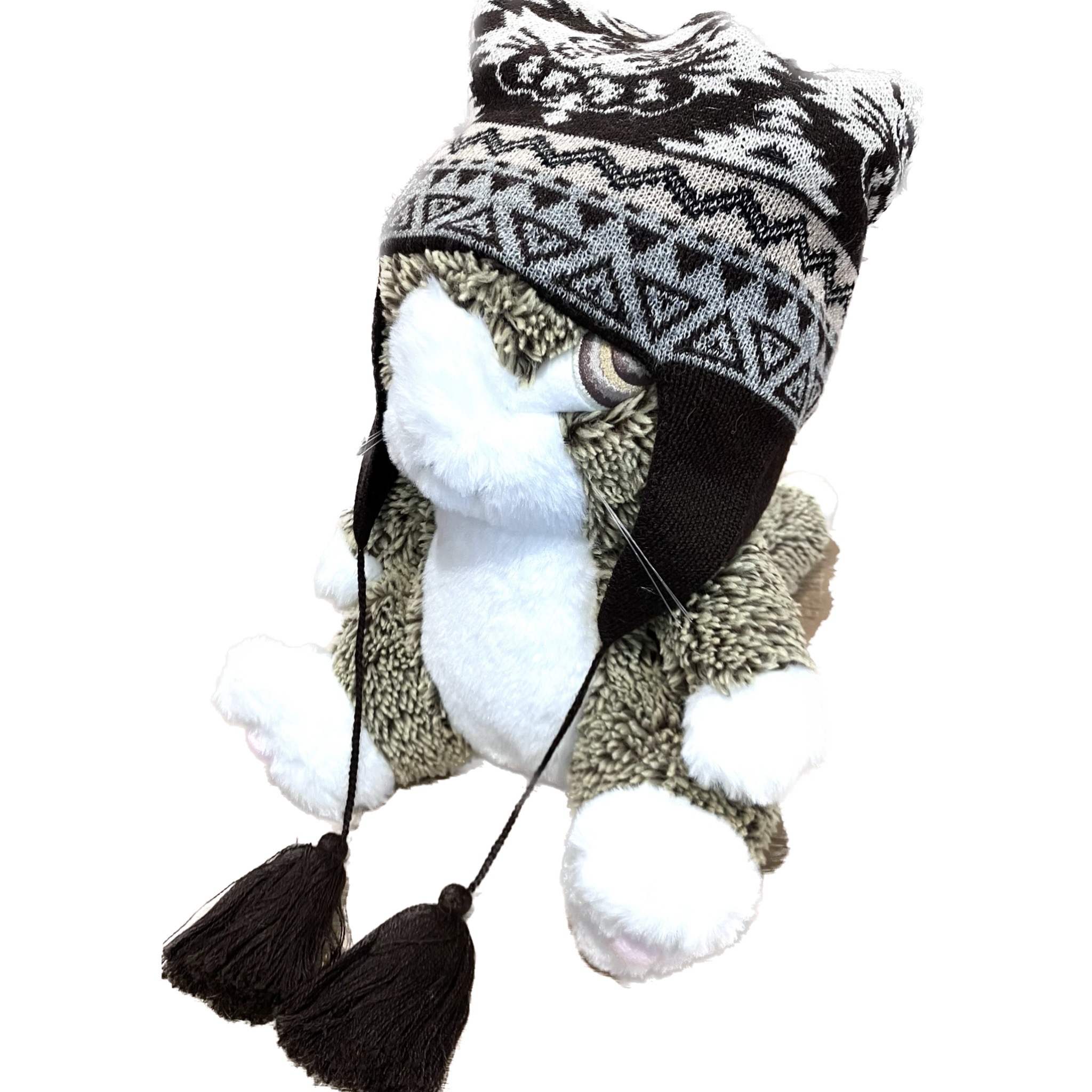 ポンポンのついた耳当て付きの「チューヨ」帽子。
