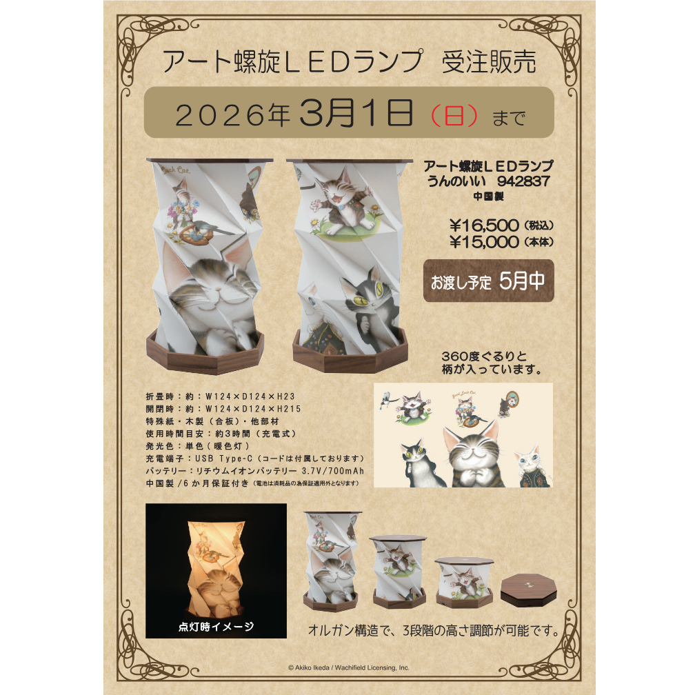 六本木ミュージアムで開催したぼくは運のいいねこ展で先行販売をしていた「アート螺旋LEDランプ」が5月下旬店頭に入荷予定です!