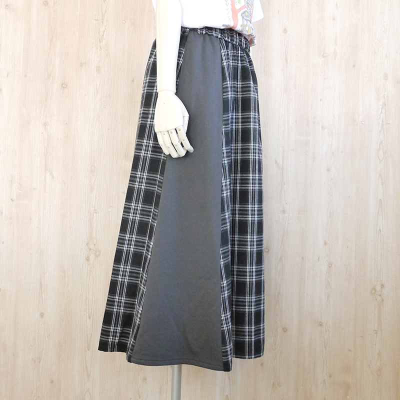 チェックの切替えデザインが個性的なロングスカート。