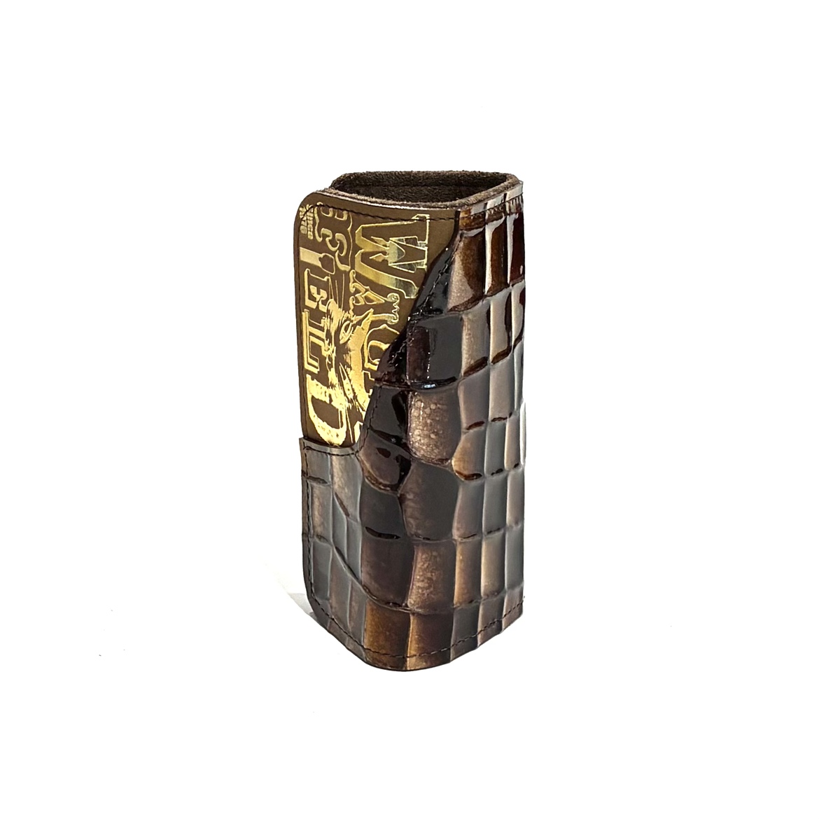 水滴を垂らしたよう革と、箔押しロゴが目を惹きます。