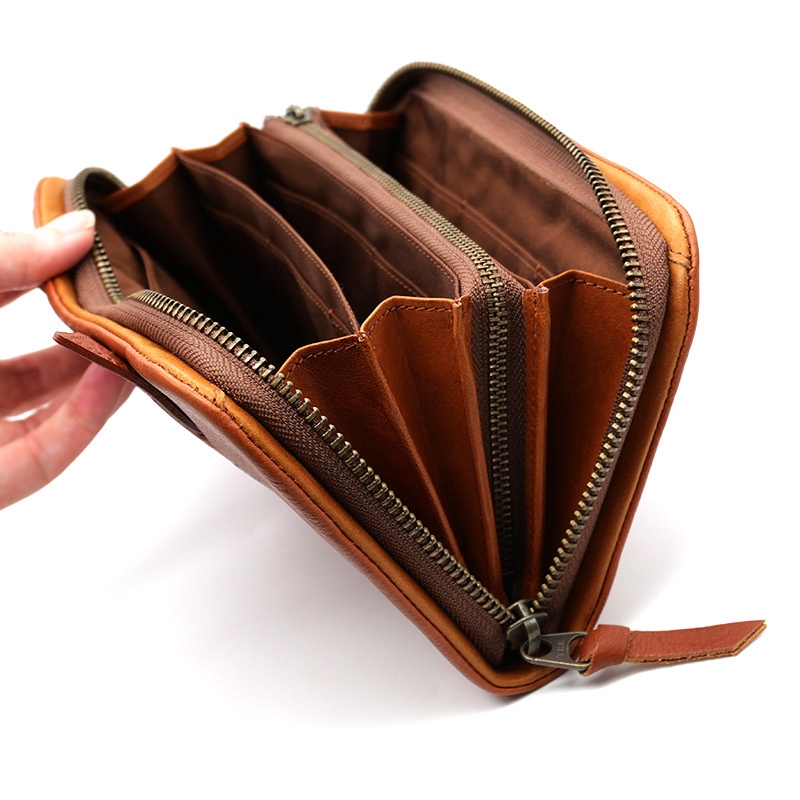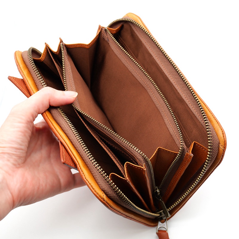 がばっと90度開く中身は一目で見渡せ、収納力もぴかいち。中央のファスナー小銭入れも、開くとマチ付きなのでとても見やすいです。