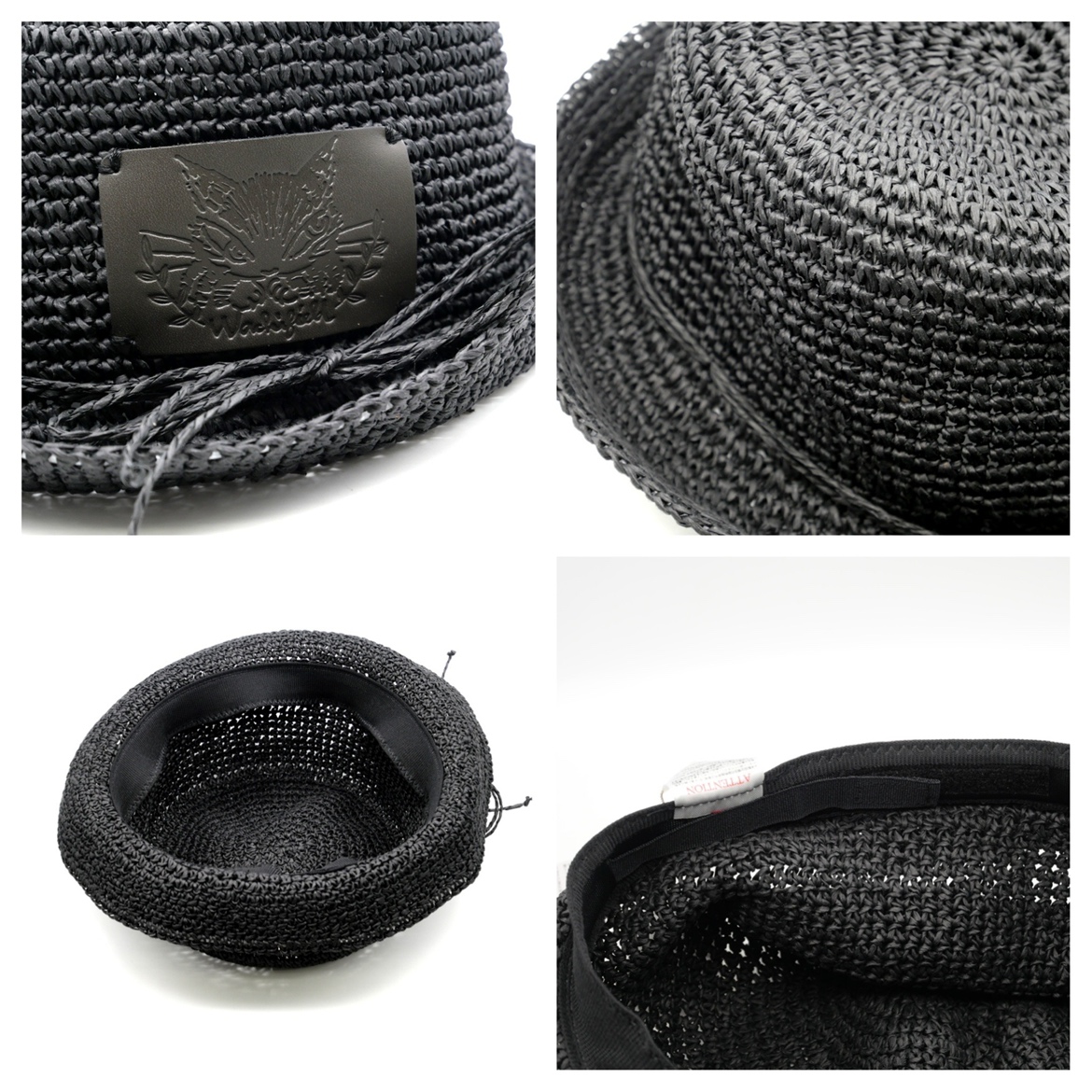 カジュアルなペーパー素材に牛革製ワッペンが付いた麦わら風帽子。