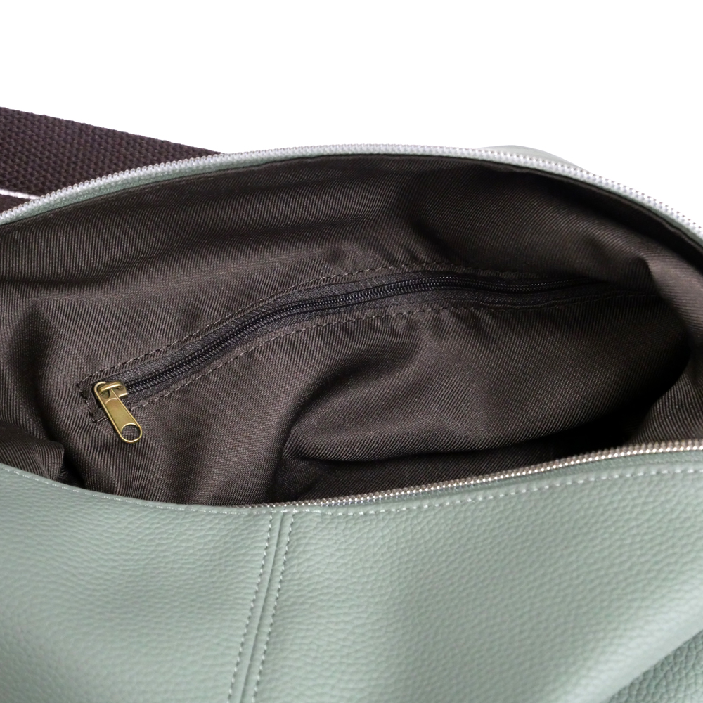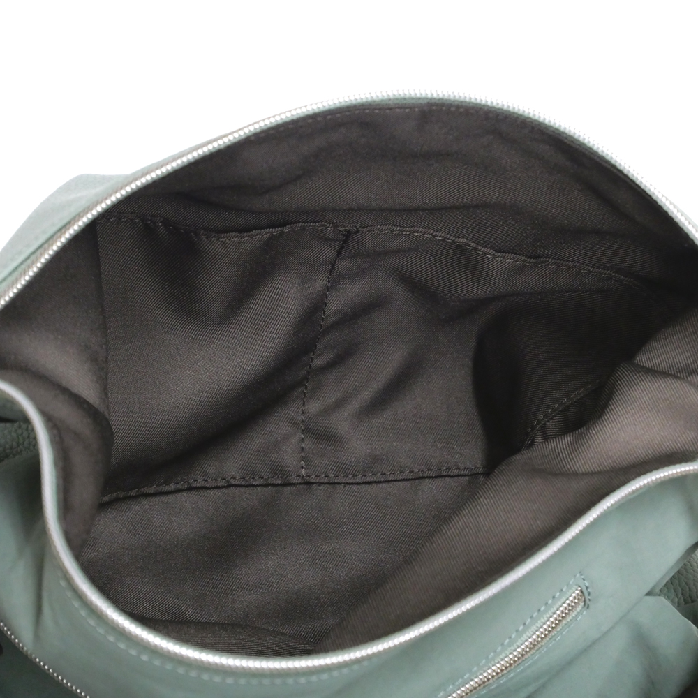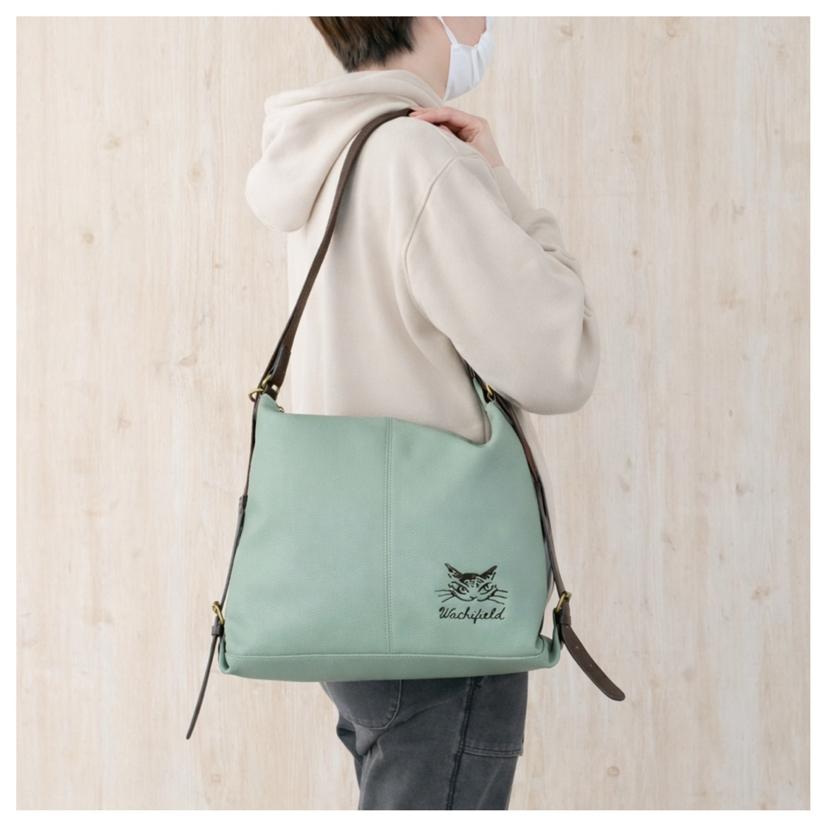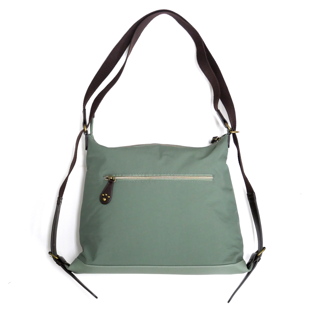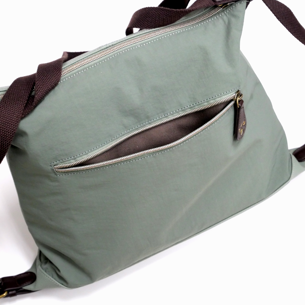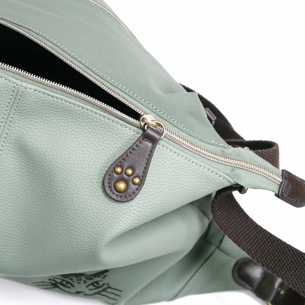 撥水性のあるスプリットレザーとナイロンを組み合わせた、軽くて上品な春色バッグ。