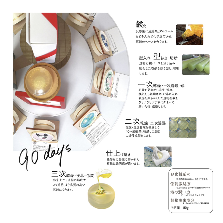 90日間の時間をかけて大事に大事に育てた透明枠練り石鹸です。