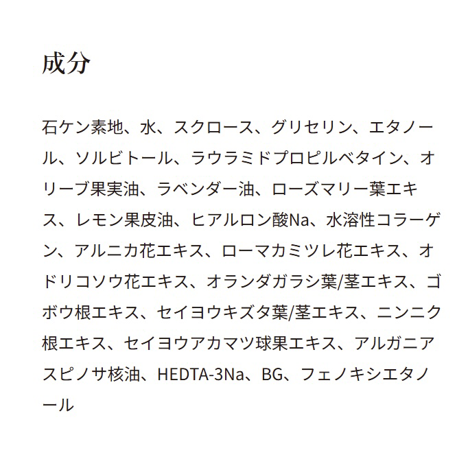 石ケン素地、水、スクロース、グリセリン、エタノール、ソルビトール、ラウラミドプロピルベタイン、オリーブ果実油、ラベンダー油、ローズマリー葉エキス、レモン果皮油、ヒアルロン酸Na、水溶性コラーゲン、アルニカ花エキス、ローマカミツレ花エキス、オドリコソウ花エキス、オランダガラシ葉/茎エキス、ゴボウ根エキス、セイヨウキズタ葉/茎エキス、ニンニク根エキス、セイヨウアカマツ球果エキス、アルガニアスピノサ核油、HEDTA-3Na、BG、フェノキシエタノール