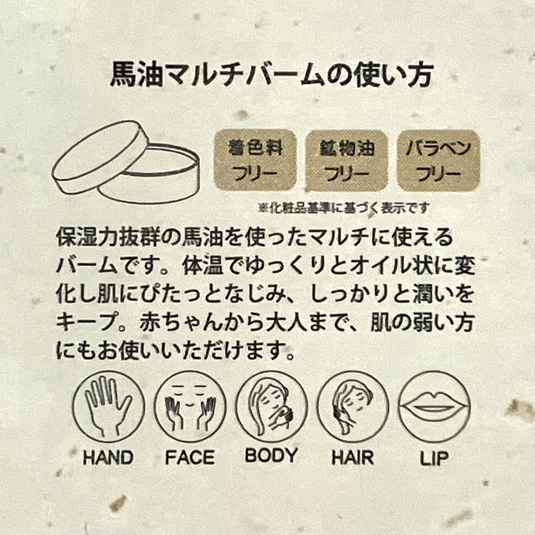 成分:コメヌカ油・部分水添馬油・シア脂・ミツロウ・香料・トコフェロール