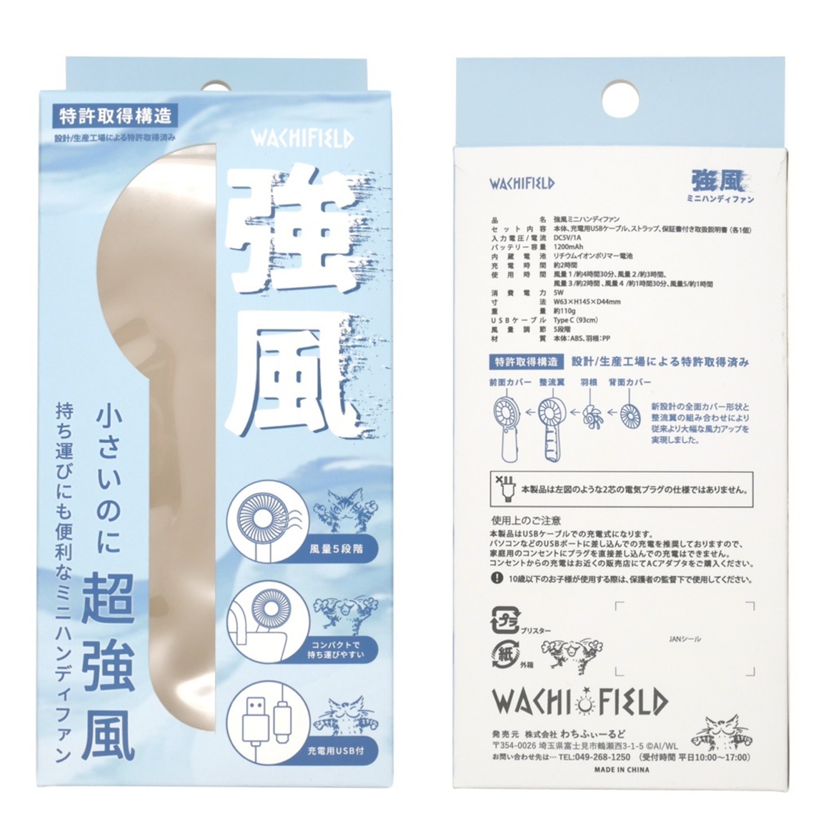 持ち運びに便利なミニハンディファンです。特許取得構造で小さいのに超強風です。