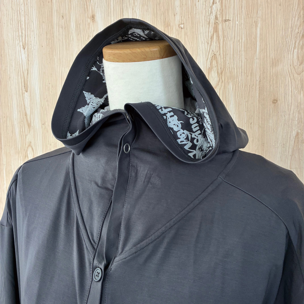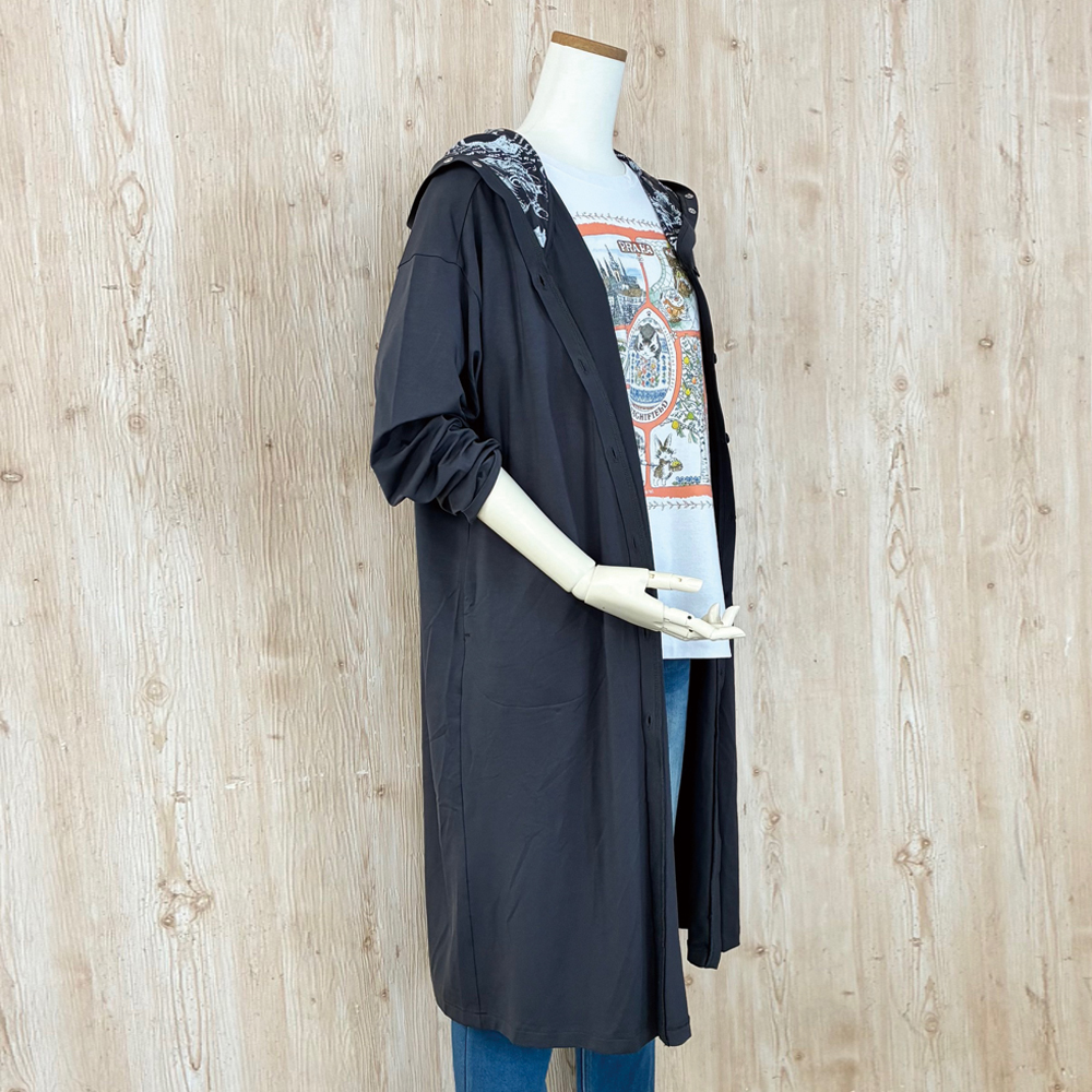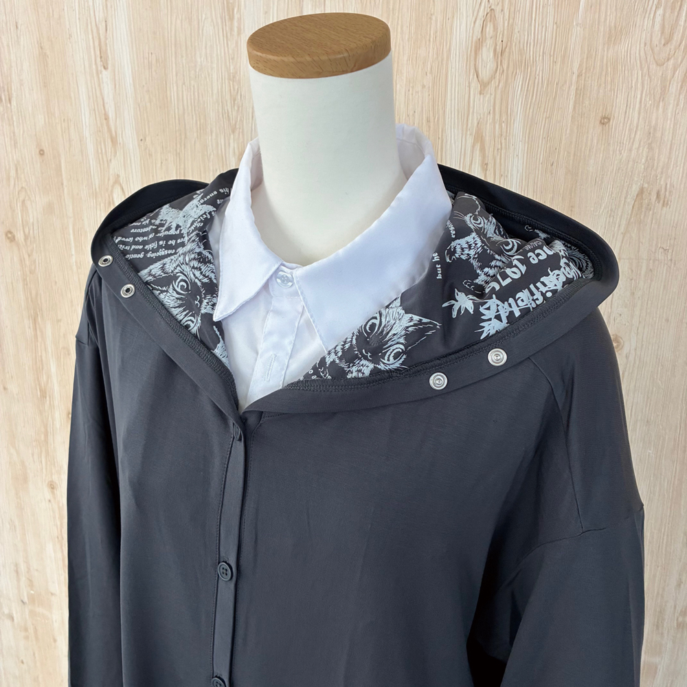 ボタンまではやや前下がりで深く、フード内側の柄がチラ見え・・・。