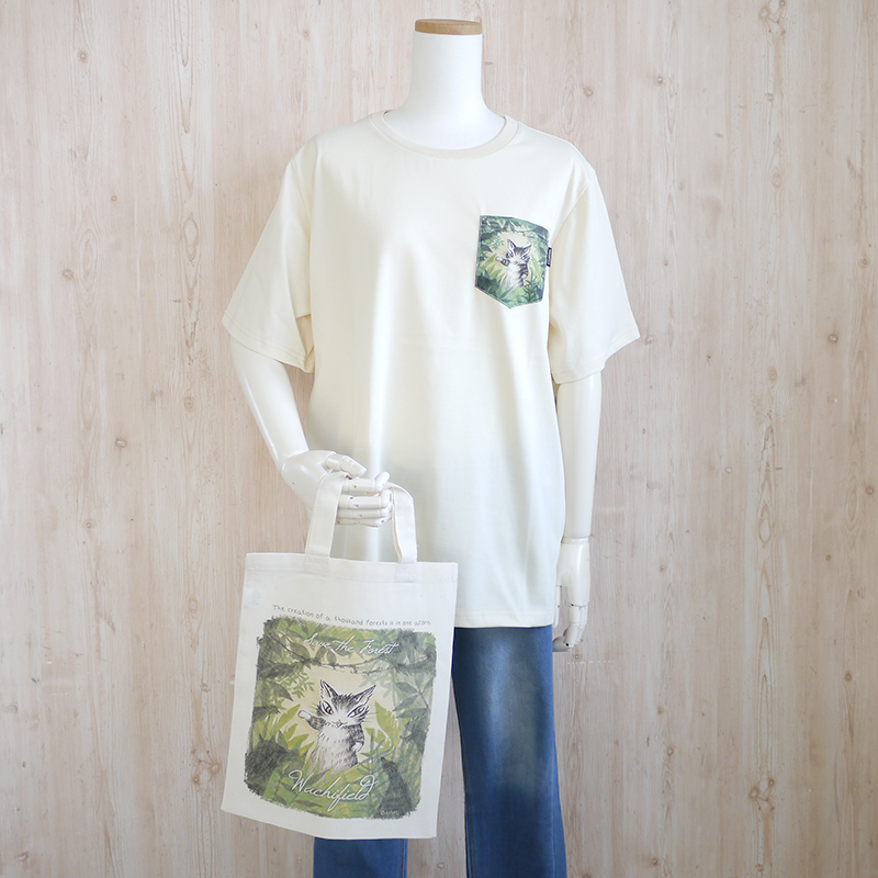 売上の一部がボルネオの環境保全に充てられる、森のスケッチ画のポケット付きTシャツとトートバッグのセット。