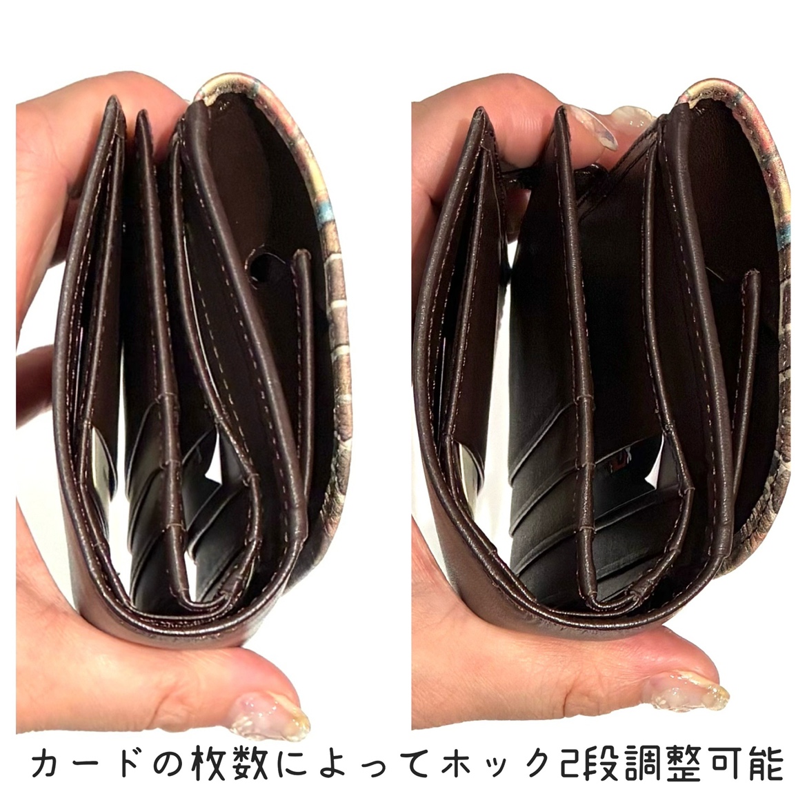 仕様:ホック開閉・ベルト付きスナップ・小銭入れスナップ開閉・札入れ×1・小銭入れ×1・カードポケット×15