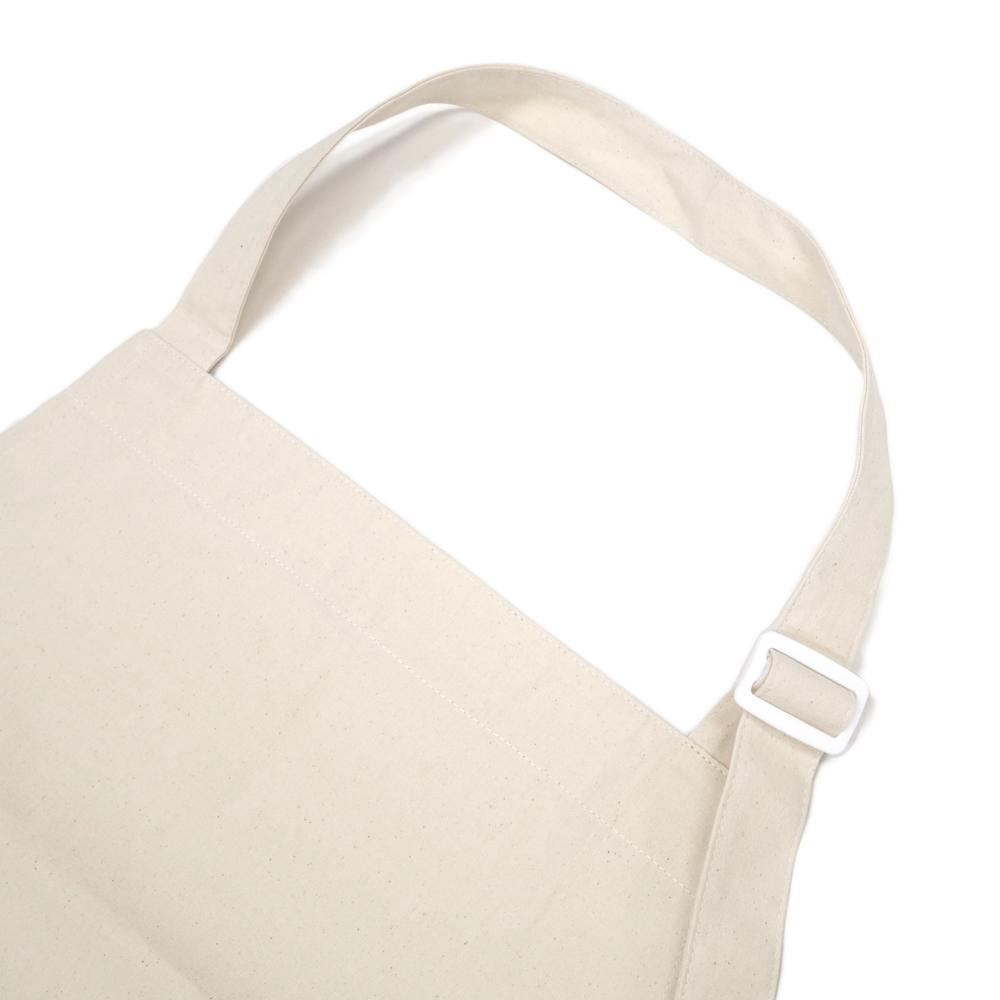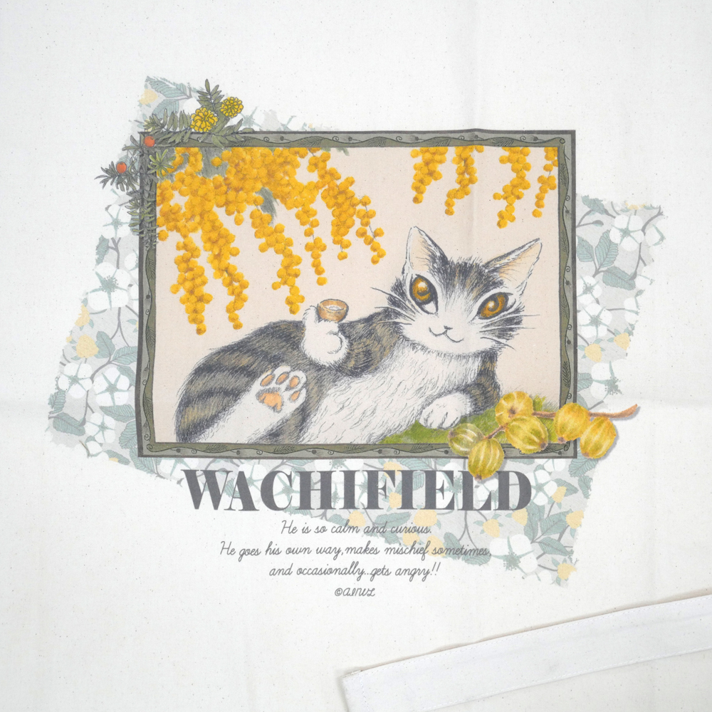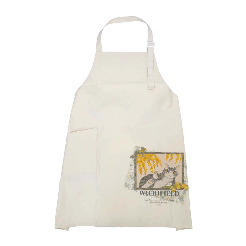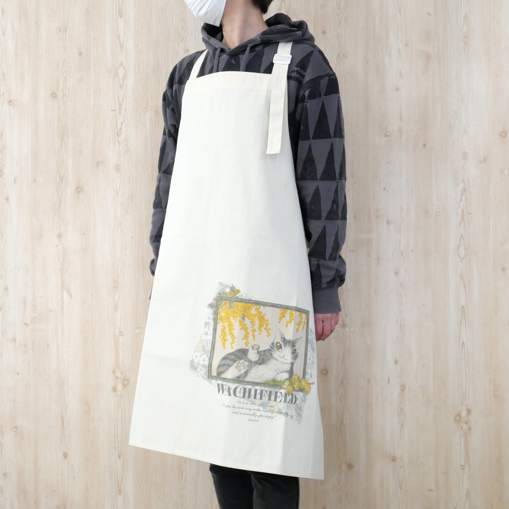 ミモザとダヤンのデザインがプリントされた、オックス生地のエプロン。